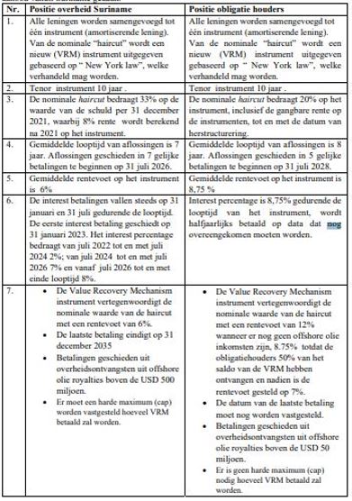 De Eurobond van USD 550 miljoen loopt in 2026 af, en de Eurobond van USD 125 miljoen loopt in november van dit jaar af. Dit betekent in feite dat Suriname in november de Eurobond van USD 125 miljoen met achterstallige rente zal moeten uitbetalen aan de bondholders. Dat Suriname hiertoe niet in staat zal zijn is reeds geruime tijd duidelijk. Het nieuws dat partijen dichtbij het punt zijn overeenstemming te bereiken voor een schuldherschikking is derhalve tegen deze achtergrond bezien zeer positief te noemen.