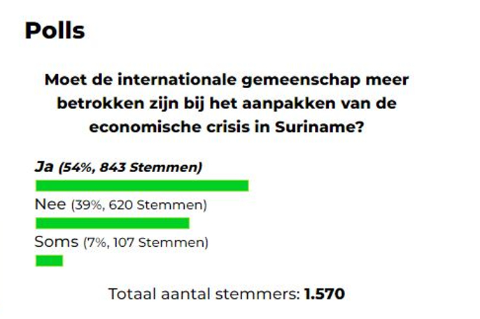 Van de 1.570 lezers en volgers van de krant die op de poll hebben gereageerd, geeft 54 procent aan (843 stemmers) aan, dat inderdaad de internationale gemeenschap betrokken moet worden bij de aanpak van de huidige economische crisis in het land. 620 mensen vinden die internationale betrokkenheid niet nodig (39%) en 107 mensen zijn van mening dat een dergelijke betrokkenheid ‘soms’ nodig is.