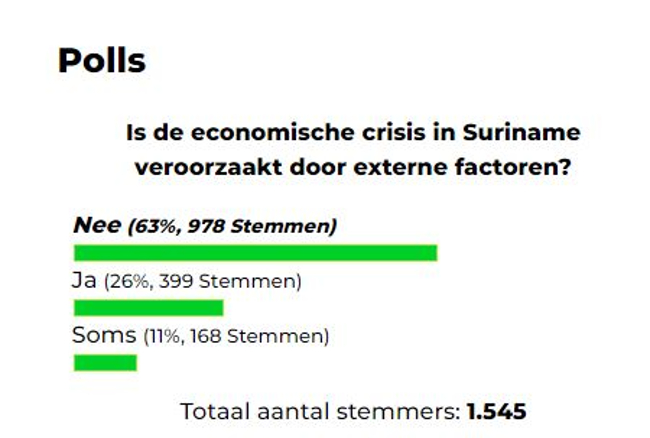 Uit een afgelopen week gehouden poll op de website van Dagblad Suriname blijkt, dat veel Surinamers van mening zijn, dat de huidige economische crisis niet is veroorzaakt door externe factoren.