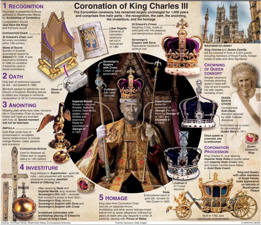 Op 6 mei 2023 vindt in de Londense Westminster Abbey een kroningsceremonie plaats voor koning Charles III en koningin Camilla. De ceremonie bestaat uit vijf hoofdonderdelen, zoals de erkenning, de eed, de zalving, de inhuldiging en het eerbetoon. De dienst wordt geleid door de aartsbisschop van Canterbury, Justin Welby. Na de eed zalft de aartsbisschop de Soeverein met heilige olie op de handen, borst en hoofd. De koning zal vervolgens plaatsnemen in de kroningsstoel die werd gemaakt in 1300. Na ontvangst van de rijksappel en de scepters plaatst de aartsbisschop de kroon van St. Edward op het hoofd van de Soeverein. De koningin-gemalin wordt samen met de koning gekroond in een vergelijkbare maar eenvoudigere ceremonie. De ceremonie wordt bijgewoond door ongeveer 2.000 gasten, waaronder leden van de koninklijke familie, buitenlandse staatshoofden en andere hoogwaardigheidsbekleders. De Britse ceremonie is het enige overgebleven evenement in zijn soort in Europa.