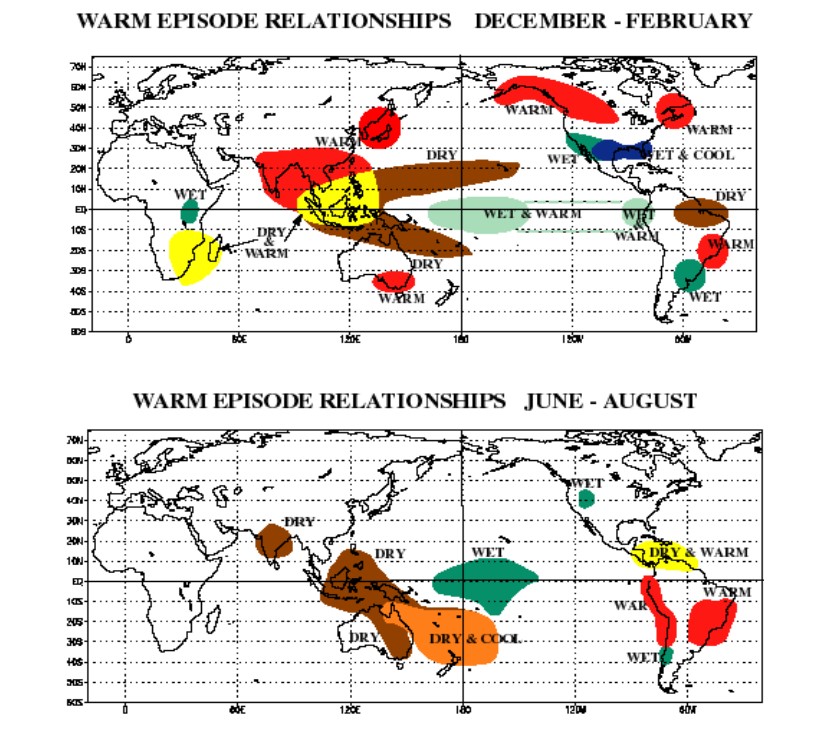 Hij stelt dat op basis van metingen van de zeewater temperatuur en windrichting in het oostelijk en centraal deel van de Stille Oceaan de wereld nu een neutrale fase heeft volgens de Internationale Weer- en Klimaatinstituten in de Verenigde Staten en Europa. De neutrale fase geeft aan de afwezigheid van La Niña en El Niño momenteel, echter er is 62% kans dat er zich een El Niño begint te ontwikkelen eind april en mei. Oehlers geeft grafisch de impact van El Niño volgens de Amerikaanse NOAA (National Oceanic and Atmospheric Administration) op het weer aan.