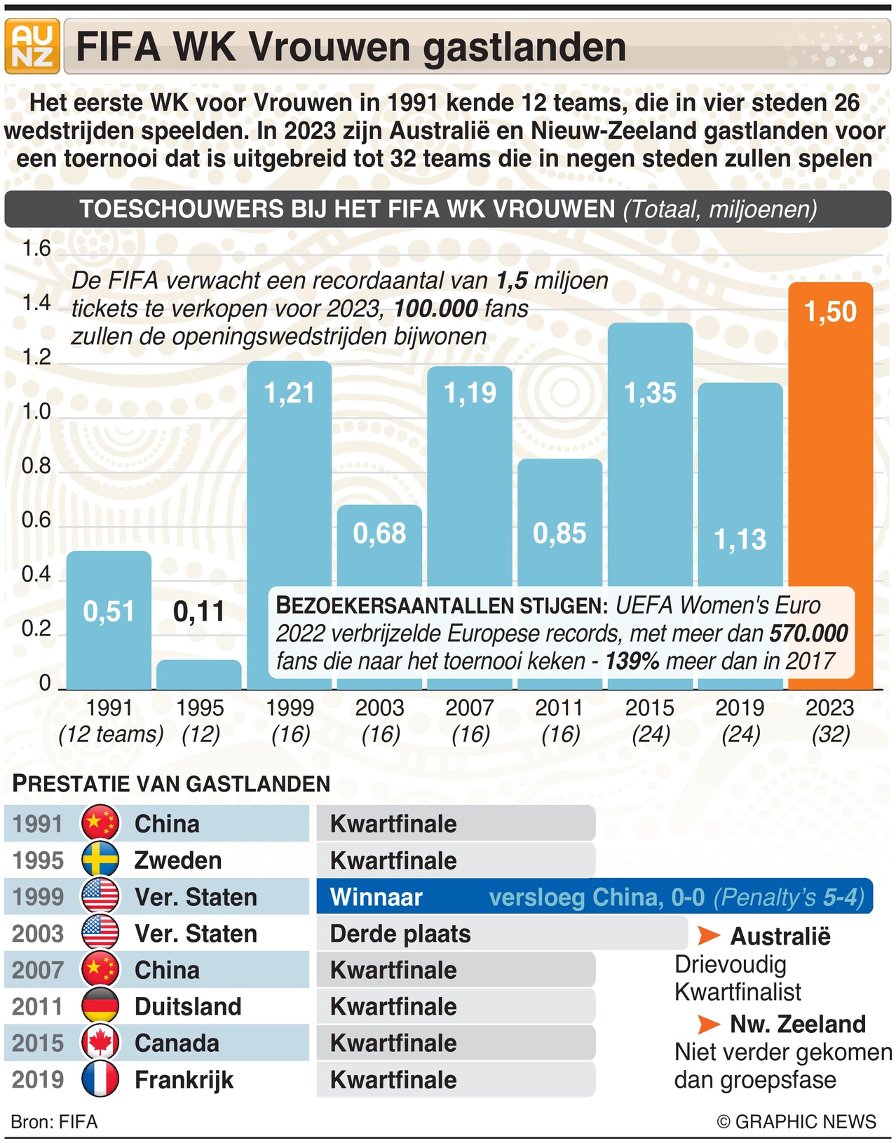 20 juli 2023 – 20 augustus 2023 – Tijdens het eerste WK in 1991 speelden 12 teams 26 wedstrijden in vier steden. In 2023 organiseren Australië en Nieuw-Zeeland een toernooi dat is uitgebreid tot 32 teams die in negen steden strijden.