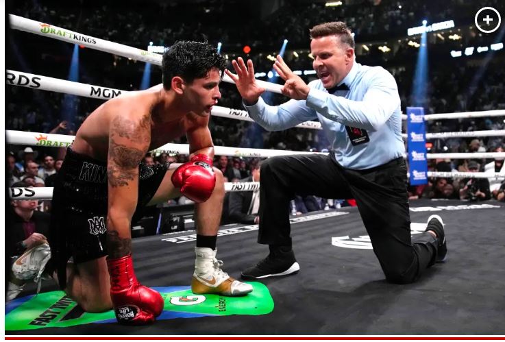 Garcia bleef staan voordat hij een paar stappen achteruit deed. Toen ging hij naar zijn rechterknie en plotseling was een langverwachte bokswedstrijd voorbij, de lichtgewicht wedstrijd eindigde zaterdagavond om 1:44 van de zevende ronde.