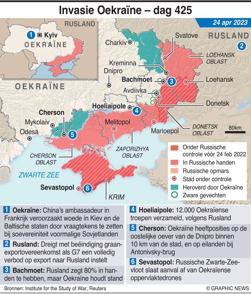 Aan de frontlinie beweert Rusland nu 80% van Bakhmut in handen te hebben, hoewel Oekraïne ontkent dat het van plan is zich terug te trekken. Oekraïne lijkt posities te hebben ingenomen op de oostelijke oever van de Dnipro-rivier bij Kherson, evenals op eilanden bij de Antonivsky-brug. Russische rapporten beweren dat tot 12.000 Oekraïense troepen zich verzamelen in de buurt van Huliaipole voor een mogelijk tegenoffensief in de oblast Zaporizhya.
