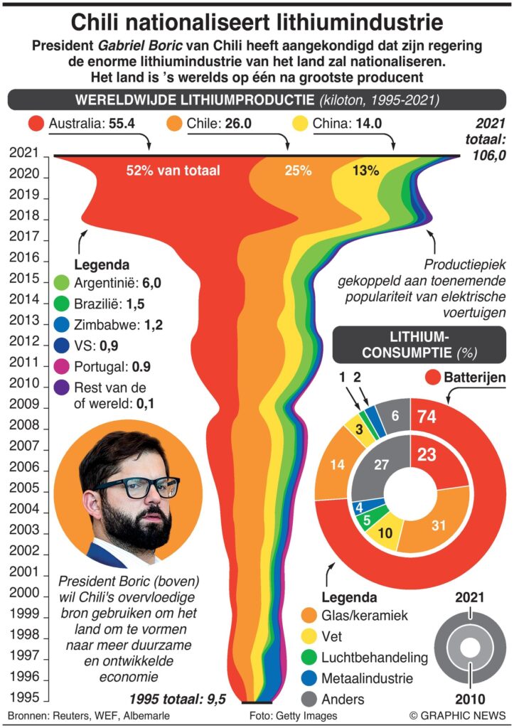 Chili heeft de grootste lithiumreserves ter wereld en daarom probeert Boric de natuurlijke hulpbron te gebruiken om zijn land om te zetten naar een meer duurzame en ontwikkelde economie.