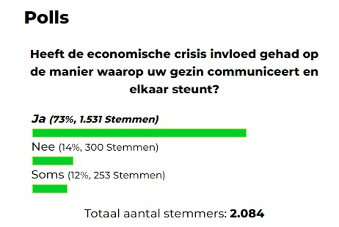 Van de 2.084 mensen die de poll hebben ingevuld, hebben er 1.531 door ‘Ja’ aan te vinken (73%) gesteld, dat de crisis wel degelijk invloed heeft op het dagelijks leven binnen het gezin. Slechts 300 personen hebben voor ‘Nee’ gekozen, 14 procent, en 253 stemmers (12 procent) kozen voor de derde optie ‘Soms’.