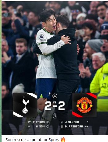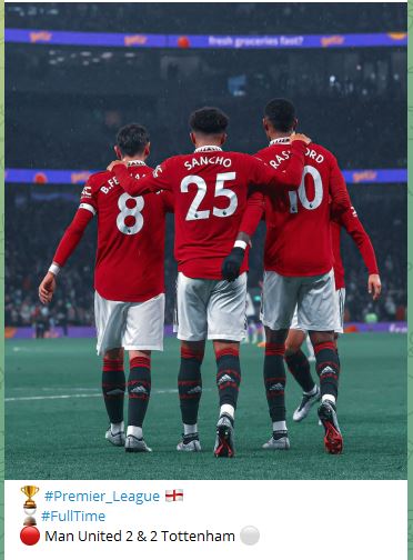 Manchester United heeft donderdagavond de voorsprong van zes punten op Tottenham Hotspur behouden. De Londenaren kregen veel kansen en kwamen terug van een achterstand, maar een winnaar volgde niet in deze topper om Champions League-voetbal.