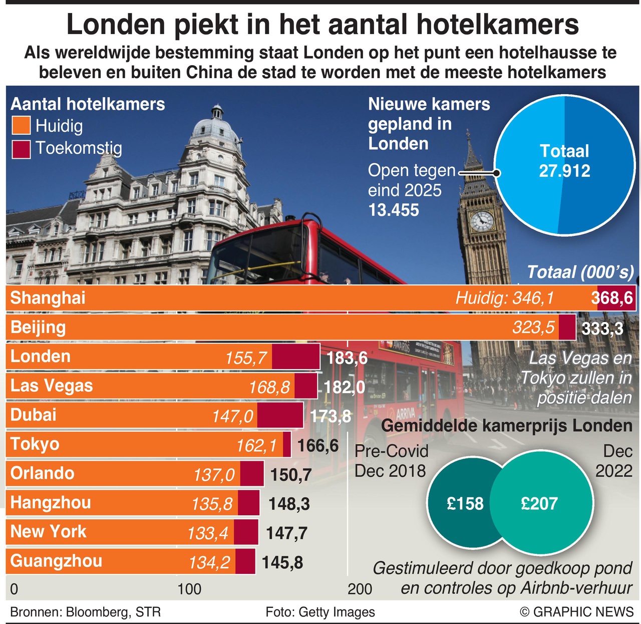 De Britse hoofdstad staat op het punt de stad te worden met de meeste hotelkamers buiten China, met een stijging van 18%, een groei die alleen door Dubai wordt geëvenaard.
