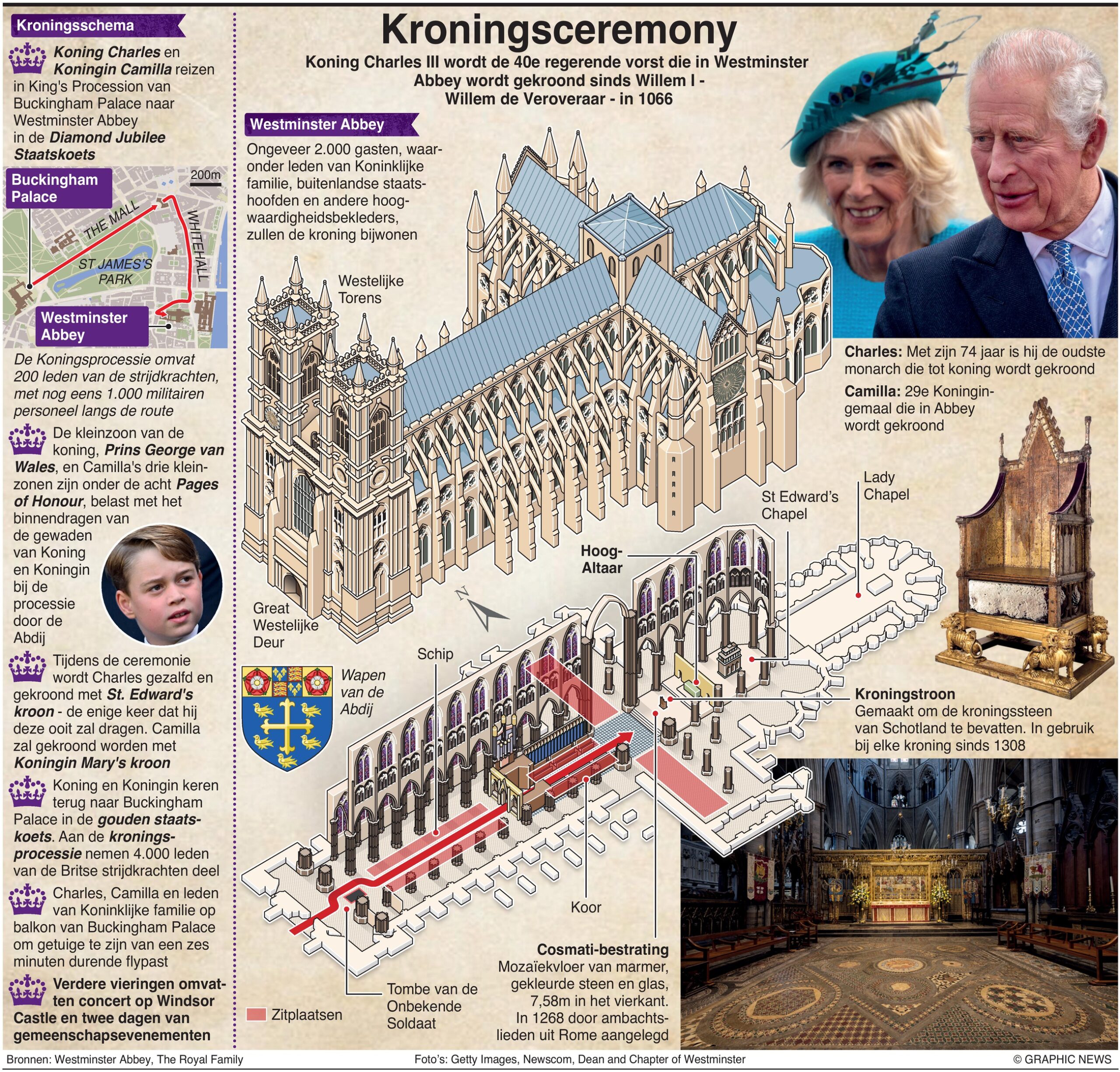 De kroning van koning Charles III vindt plaats in de Londense Westminster Abbey. Charles zal de 40e regerende monarch zijn die in Westminster Abbey wordt gekroond sinds Willem I, beter bekend als Willem de Veroveraar, in 1066.