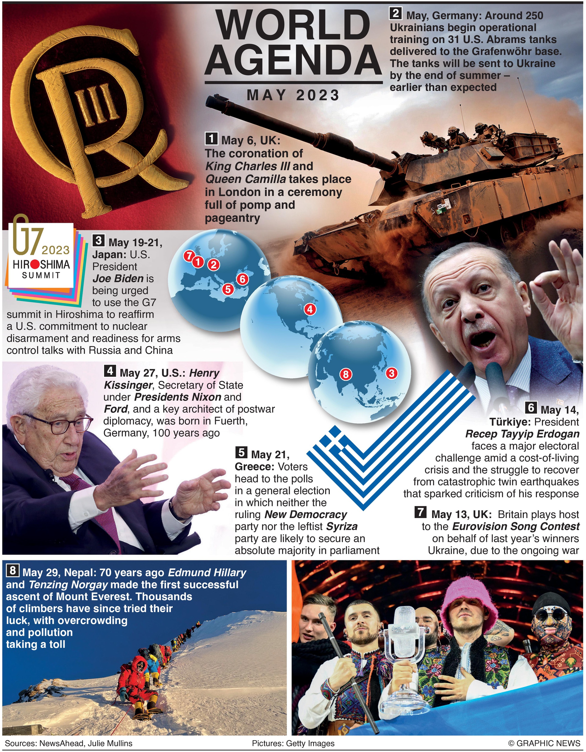 1 mei 2023 – 31 mei 2023 – Evenementen in mei zijn onder meer de kroning van koning Charles III, de training van Oekraïense soldaten over het gebruik van Amerikaanse Abrams-tanks in Duitsland, verkiezingen in Türkiye en Griekenland, en de G7-bijeenkomst in Hiroshima.