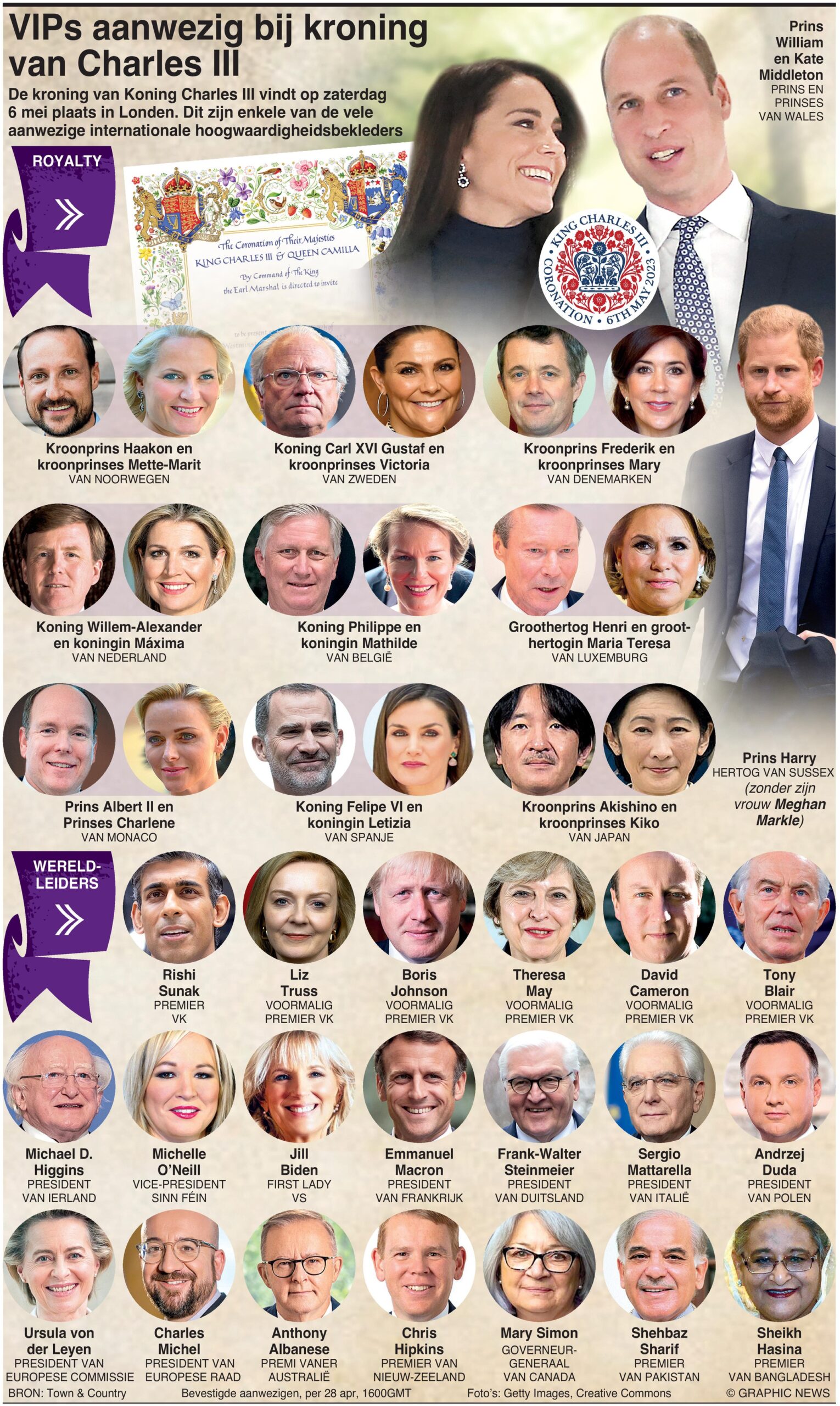 6 mei 2023 – De kroning van koning Charles III vindt plaats in Londen op zaterdag 6 mei. Er zullen zo’n 2.000 gasten aanwezig zijn, van wie velen VIP’s en internationale hoogwaardigheidsbekleders zijn.