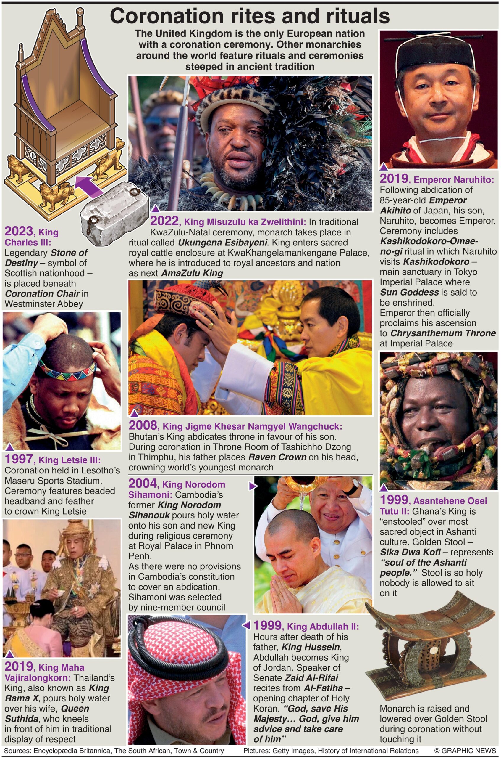 Het Verenigd Koninkrijk is het enige Europese land met een kroningsceremonie. Andere monarchieën over de hele wereld hebben rituelen en ceremonies die doordrenkt zijn van oude tradities.