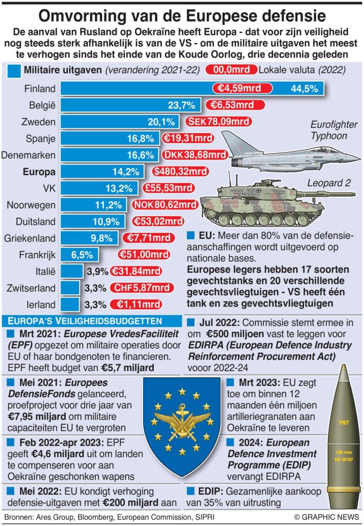 Na de brute aanvalsoorlog van Rusland in Oekraïne stegen de militaire uitgaven van Europa van 420,7 miljard dollar in 2021 tot 480,3 miljard dollar vorig jaar – een stijging van 14,2 procent, volgens de denktank Stockholm International Peace Research Institute.