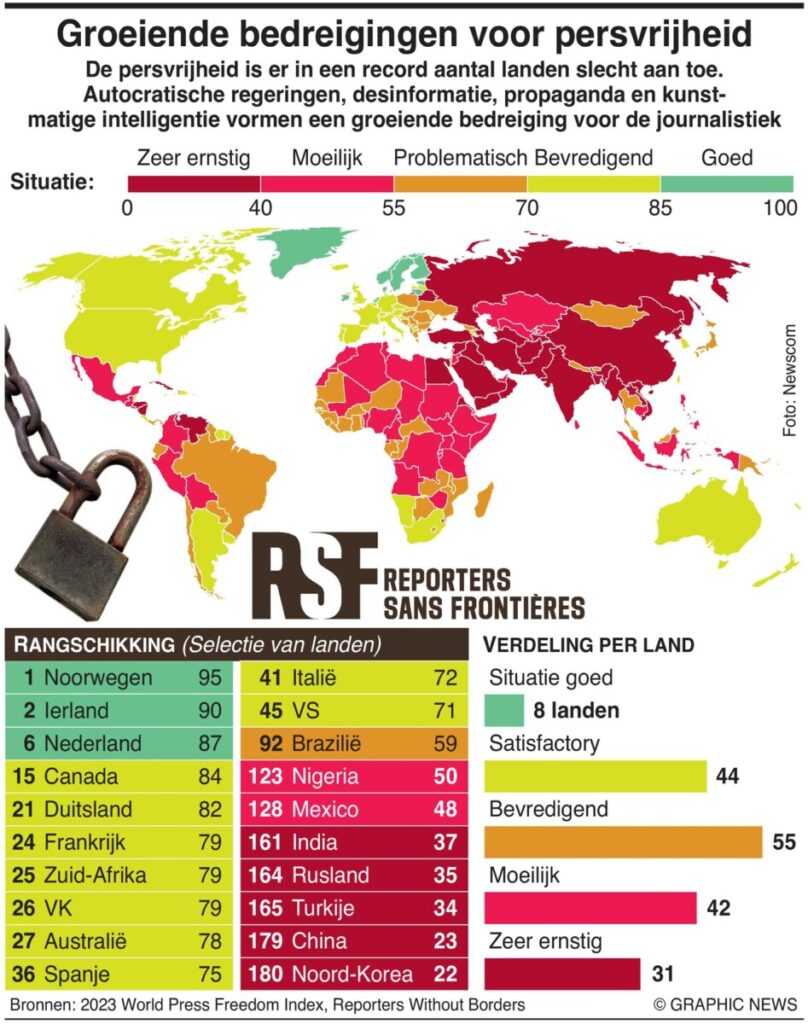 Persvrijheid verkeert in een recordaantal landen in een erbarmelijke staat, met autocratische regeringen, desinformatie, propaganda en kunstmatige intelligentie die een groeiende bedreiging vormen voor de journalistiek.