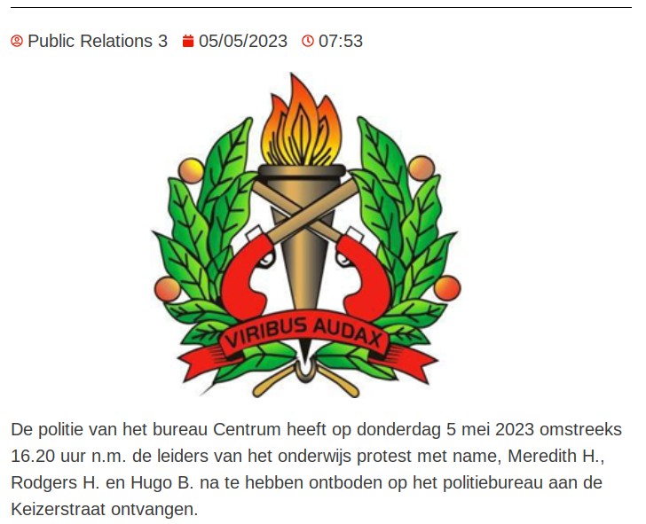 “De politie van het bureau Centrum heeft donderdagmiddag 5 mei de leiders van het onderwijs protest, met name Meredith H., Rodgers H. en Hugo B., na te hebben ontboden, op het politiebureau aan de Keizerstraat ontvangen”, zo meldt het Korps Politie Suriname.