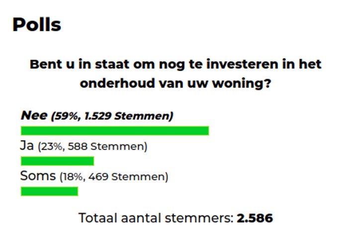 59% van de mensen die hebben gereageerd, 1.529 personen, geeft aan dat zij niet meer in staat zijn om te investeren in het onderhoud van de woning. Slechts 588 personen, 23%, stelt nog wel in staat te zijn om dat te doen en 18 procent (469 personen) heeft aangegeven af en toe nog wat te kunnen investeren in het onderhoud van hun woning.