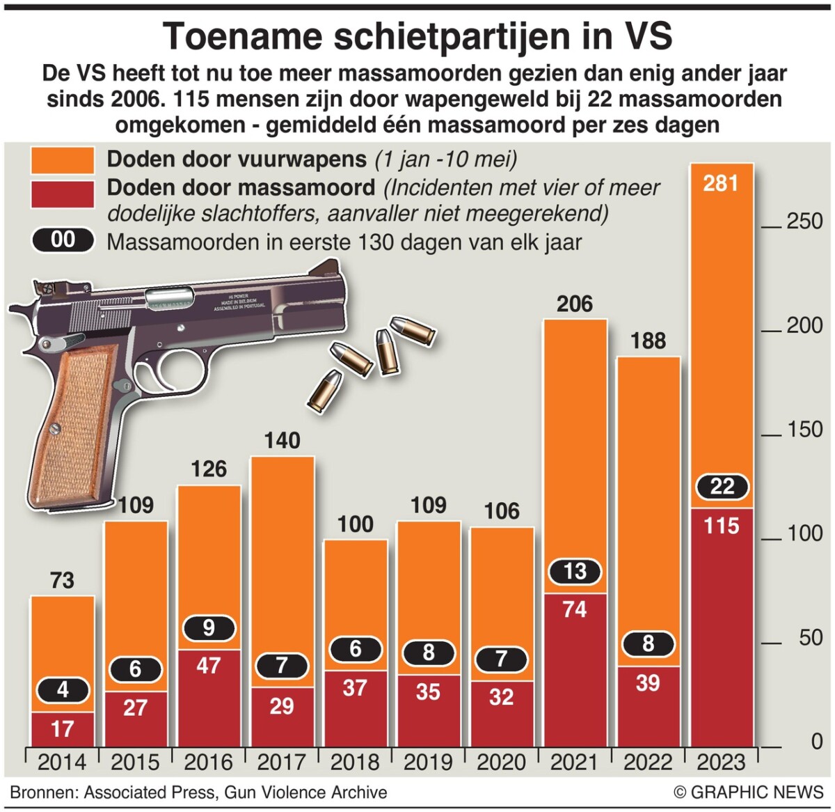 May 10, 2023 – In de VS zijn tot nu toe meer massamoorden gepleegd dan in enig ander jaar sinds 2006. Gedreven door wapengeweld zijn 115 mensen omgekomen bij 22 massale schietpartijen — gemiddeld één massamoord per zes dagen.