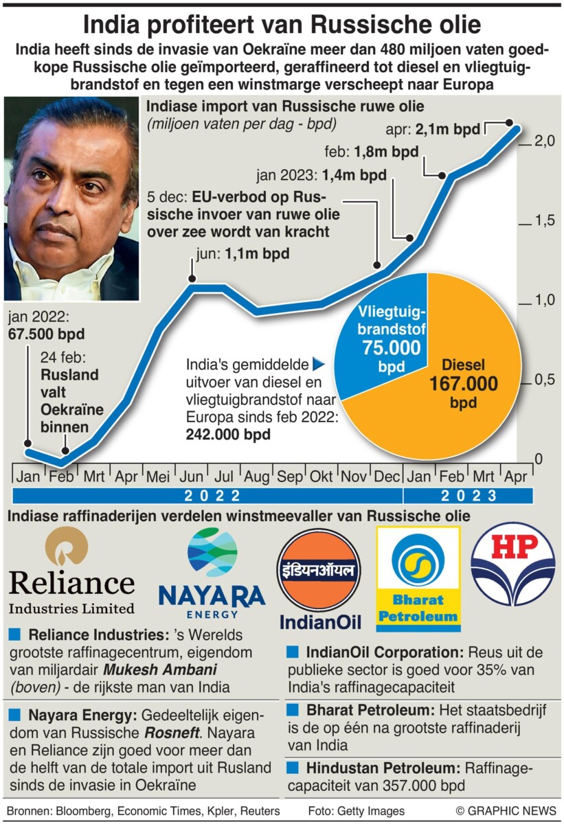In 2021 was Russische olie goed voor slechts 2 procent van de jaarlijkse invoer van ruwe olie in India. Dat cijfer staat nu op bijna 20 procent, volgens de door de Indiase staat gecontroleerde geldschieter Bank of Baroda.