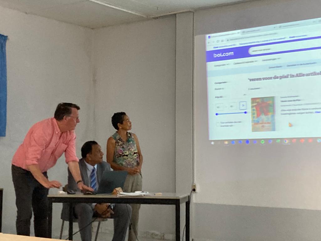 (Foto-bijschrift: Cees Klapwijk van de Stichting Boekenportaal Suriname koopt via bol.com de Surinaams jeugdklassieker ‘Veren voor de piai’ voor de nieuwbakken minister van Onderwijs, Wetenschap en Cultuur, Henri Ori. Schrijfster Ismene Krishnadath kijkt aandachtig toe.)