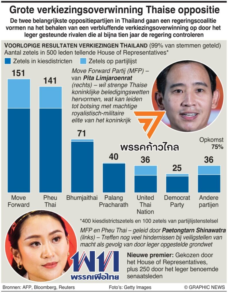De Move Forward-partij en oppositiezwaargewicht Pheu Thai domineerde de stemming van zondag in een verbluffende nederlaag van door het leger gesteunde partijen, maar ze zouden voor uitdagingen kunnen komen te staan om genoeg steun te verzamelen, met parlementaire regels opgesteld door het leger na een staatsgreep in 2014 die in het voordeel van zijn bondgenoten was.