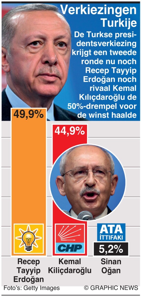 Met 98,6 procent van de stemmen geteld (06:52GMT), zei de Turkse Hoge Verkiezingsraad dat Erdoğan 49,9 procent van de stemmen heeft gewonnen, slechts ternauwernood voor de 50 procent die nodig is voor een regelrechte overwinning. Kılıçdaroğlu heeft 44,9 procent veiliggesteld, wat een teleurstellende opiniepeiling was dat hij een kleine voorsprong had. Sinan Ogan krijgt 5,3% en wordt uitgeschakeld in de race