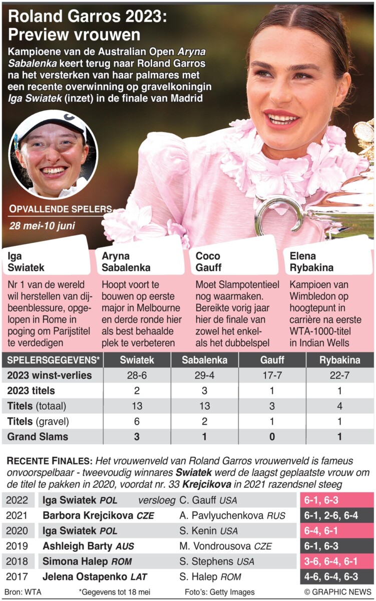 28 mei 2023 – 11 juni 2023 – Roland Garros, het tweede Grand Slam-toernooi van het seizoen, vindt plaats in Parijs, Frankrijk. Australian Open-kampioen Aryna Sabalenka keert terug naar Roland Garros na haar titelversterking met de recente overwinning op gravelkoningin Iga Swiatek in de finale van Madrid.