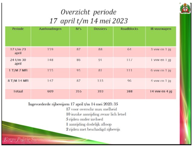 In het kader van de veiligheidshandhaving heeft de politie in de periode van 17 april tot en met 14 mei 2023 landelijk 388 roadblocks uitgevoerd. In vier weken tijd zijn 609 aanhoudingen verricht, waarbij in totaal 355 verdachten in verzekering zijn gesteld. Het betreft ernstige strafbare feiten, waaronder berovingen, overvallen, inbraken, drugs-, zeden- en economische delicten.