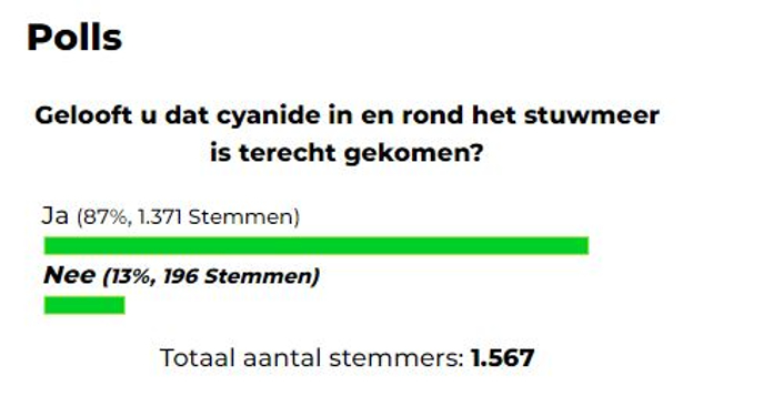 Van de 1.567 mensen die de poll hebben ingevuld hebben maar liefst 1.371 mensen de optie ‘Ja’ aangevinkt (87 procent) hebben. 13 procent (186 stemmers) gelooft niet dat cyanide in het water van het stuwmeer is beland.
