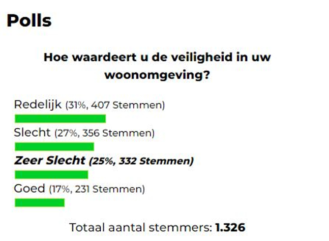 De poll werd door 1.326 mensen ingevuld en daarvan laten 407 (31 procent) weten de veiligheidssituatie in de woonomgeving ‘redelijk’ te vinden. 356 personen beoordelen die situatie als ‘slecht’ (27%), ‘zeer slecht’ is door 332 stemmers (25 procent) aangevinkt en slechts 17 procent (231 personen) zijn wel tevreden.