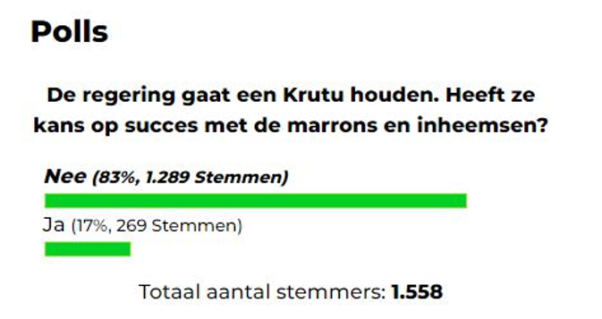 In een poll op de website van Dagblad Suriname werd afgelopen week de vraag gesteld of de regering kans op succes heeft wanneer zij een krutu houdt met marrons en inheemsen. Van de 1.558 lezers en volgers van Dagblad Suriname hebben 1.289 personen (83 procent) de optie ‘Nee’ ingevuld. Maar 17%, 269 stemmers, denken dat een krutu wel tot enig succes kan leiden.