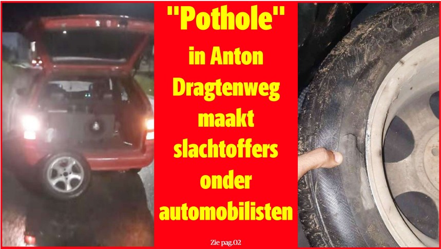 Een gemene “pothole” in het wegdek van de Anton Dragtenweg in de strekking tussen de Bonistraat en Clevia, heeft in het weekeinde verschillende slachtoffers gemaakt onder automobilisten. Vanwege het regenweer staat de kuil helemaal onder een plas water en is daardoor niet te zien. Vooral ’s avonds.