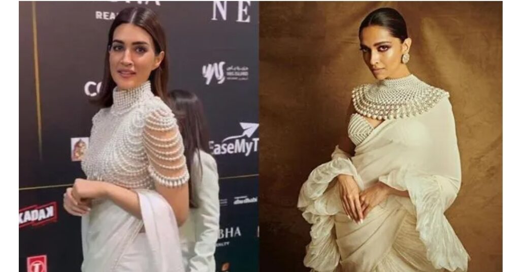 Kriti Sanon droeg onlangs een witte sari met een blouse met parelkralen tijdens de 2023 IIFA Awards-ceremonie in Abu Dhabi. Netizens hebben vergelijkingen gemaakt tussen Kriti’s look en die van Deepika Padukone in 2022 voor het Filmf Festival van Cannes.