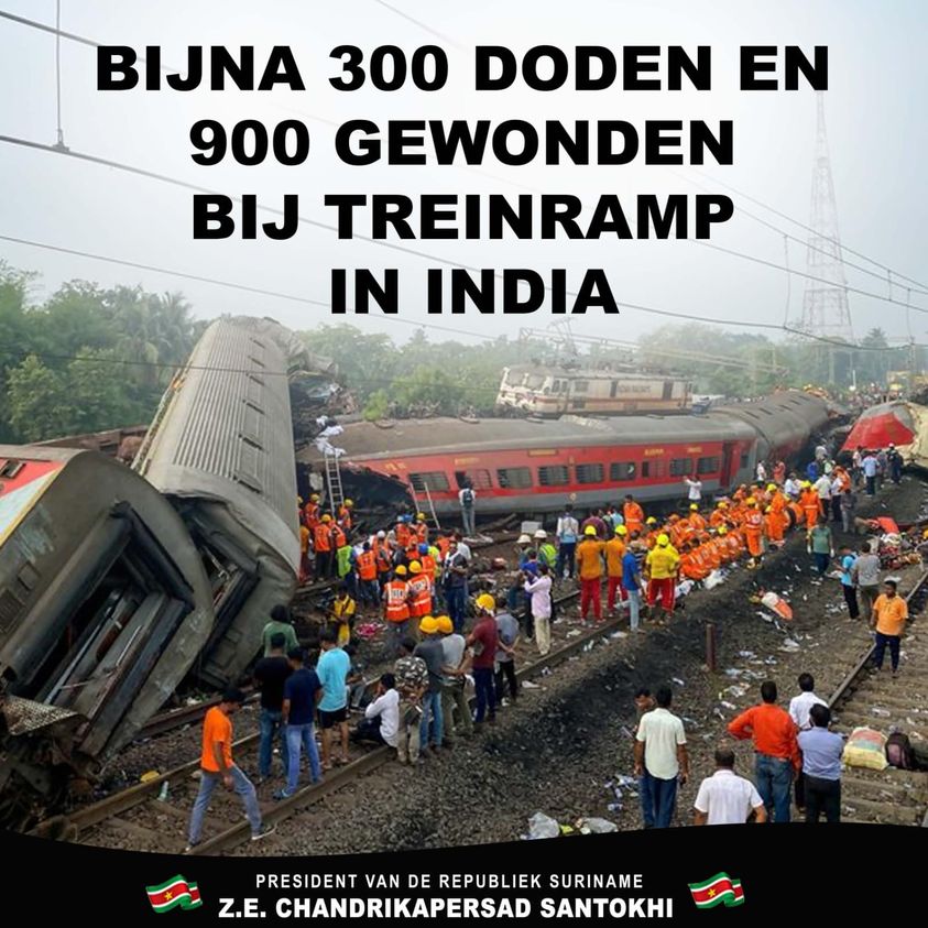 “Diep bedroefd heb ik kennisgenomen van het ernstige treinongeluk in de oostelijke deelstaat Odisha, in India. Daarbij zijn er een groot aantal doden en gewonden te betreuren. Morgen, zondag 4 juni, is in India uitgeroepen tot nationale rouwdag. De president van India, Hare Excellentie Droupadi Murmu, wordt morgen in Suriname verwacht. Als gevolg van het tragisch ongeval tonen wij ons medeleven aan het Indiase staatshoofd en volk. Ik condoleer de Indiase gemeenschap en wens eenieder veel sterkte toe. Wij bidden ook voor het herstel van de gewonden. Onze gedachten gaan in deze tijd van rouw in het bijzonder uit naar de families van de slachtoffers alsook naar alle gewonden en wens hen veel sterkte toe.“