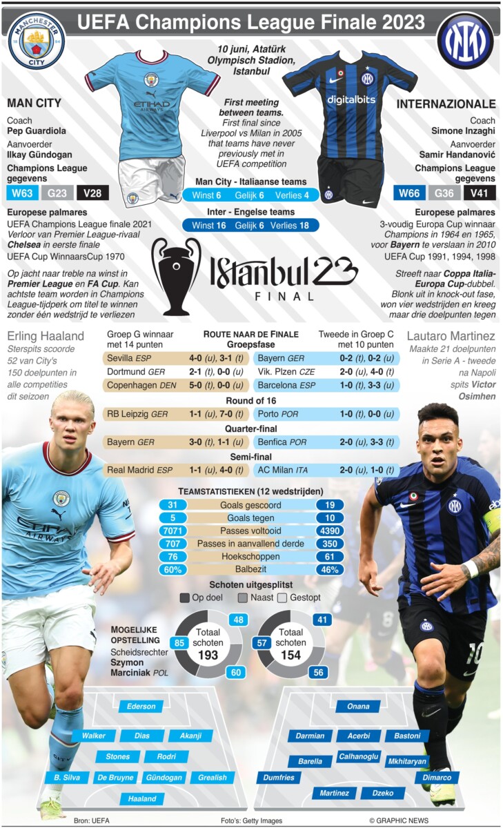 10 juni 2023 – De UEFA Champions League-finale vindt plaats tussen de Engelse Premier League-zwaargewichten Manchester City en de Italiaanse drievoudig Europa Cup-winnaars Internazionale, in het Atatürk Olympisch Stadion in Istanbul.