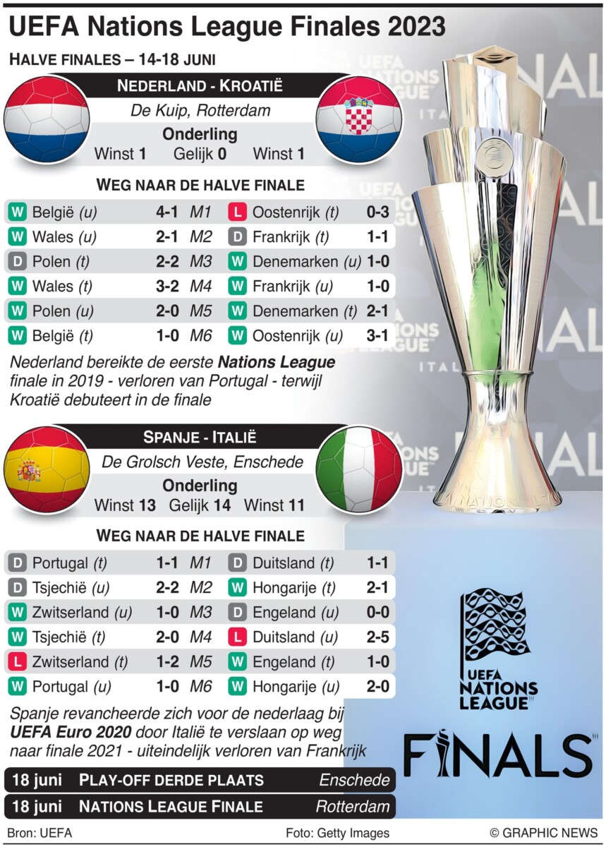 14 juni 2023 – 18 juni 2023 – De laatste fase van de derde editie van UEFA’s nieuwste nationale teamcompetitie vindt plaats in de Nederlandse steden Rotterdam en Enschede, en toont de vier groepswinnaars van de best gerangschikte League A: Nederland , Kroatië, Italië en Spanje.