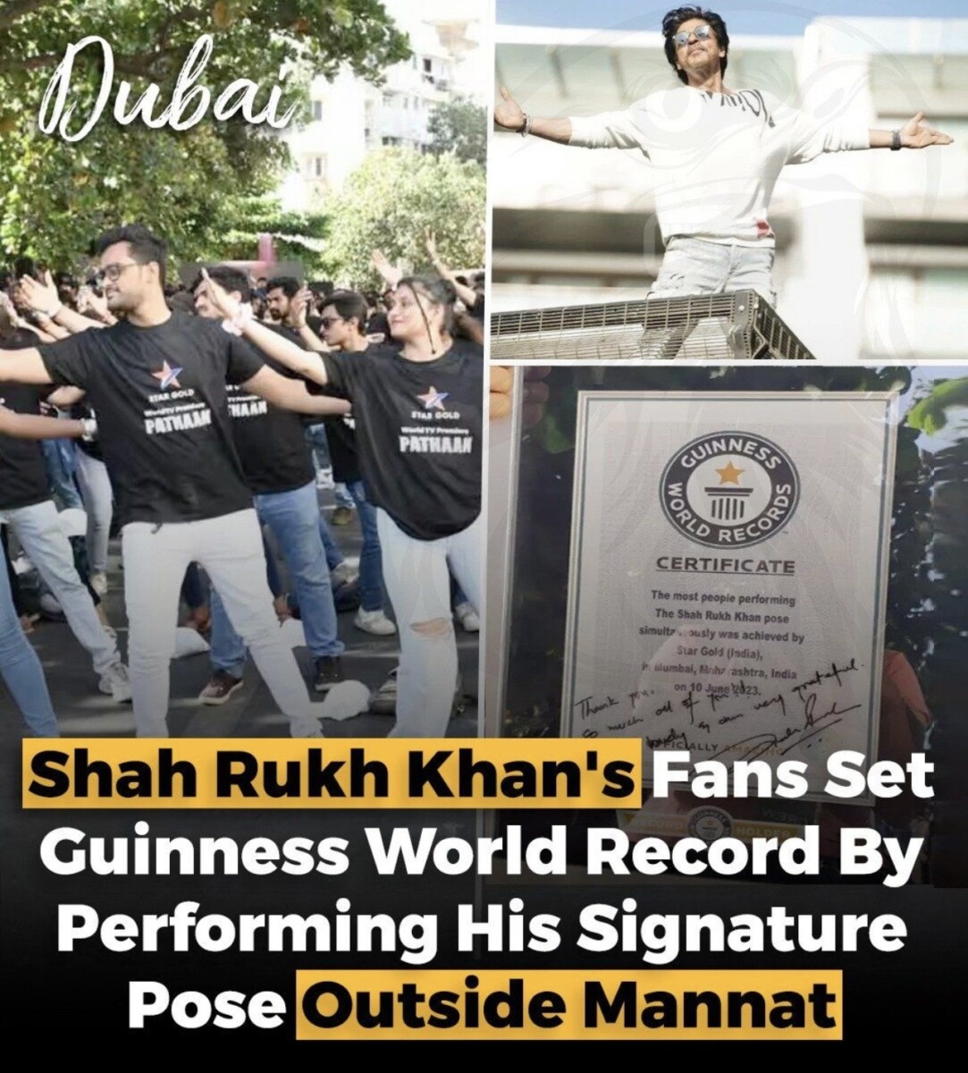 Fans van Shah Rukh Khan verzamelden zich zaterdag buiten zijn huis Mannat om het Guinness World Record te vestigen voor de meeste mensen die de kenmerkende pose van SRK uitvoeren. Bijna 300 fans van King Khan staken hun handen uit in SRK’s iconische pose buiten Mannat.
