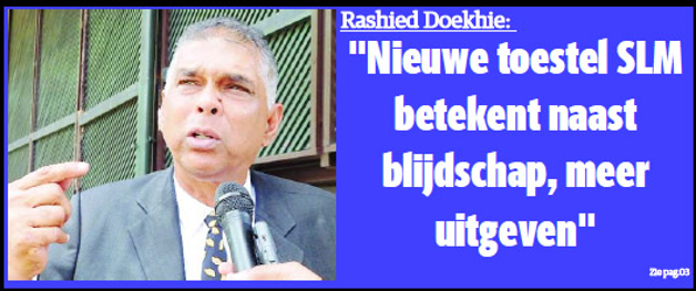 “Het zou goed zijn als dat aan het volk verteld zou worden. Wat zijn de kosten van brandstof, de geweldige auto’s, en niet te vergeten het personeel? We weten sinds jaar en dag, dat er te veel personeelsleden zijn bij het SLM. Vertel wat de personeelskosten zijn. Hoeveel worden de mensen betaald die werken bij de SLM? Als je de inkomsten die alleen bestaat uit ticketverkoop aftrekt van de uitgaven,, dan merk je zelf dat je je hart gaat vasthouden om niet op te staan een ochtend en te vernemen dat de nieuwe gehuurde kist voor de SLM weer aan de ketting zal worden gelegd, omdat de uitgaven hoger zijn dan de inkomsten. Er is geen enkele nieuwigheid. Precies hetzelfde zal wederom gebeuren”, zegt Doekhie.