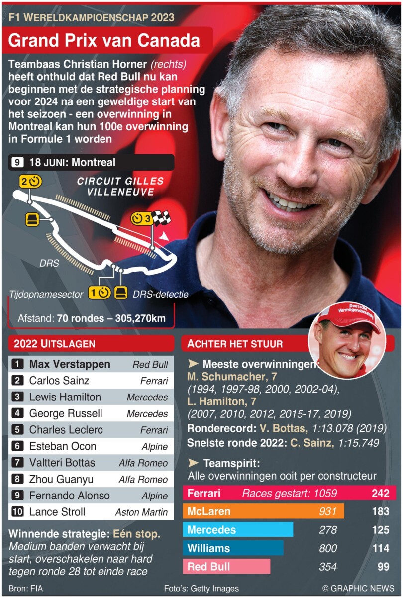 16 juni 2023 – 18 juni 2023 – Het 74e Formule 1 Wereldkampioenschap gaat verder met ronde 9, de Canadese GP, die plaatsvindt over 70 ronden van het 4,361 km lange Circuit Gilles-Villeneuve. Teambaas Christian Horner heeft onthuld dat Red Bull nu kan beginnen met strategische planning voor 2024 na een heerszuchtige start van het seizoen – een overwinning in Montreal zou hun 100e overwinning in de Formule 1 veiligstellen.