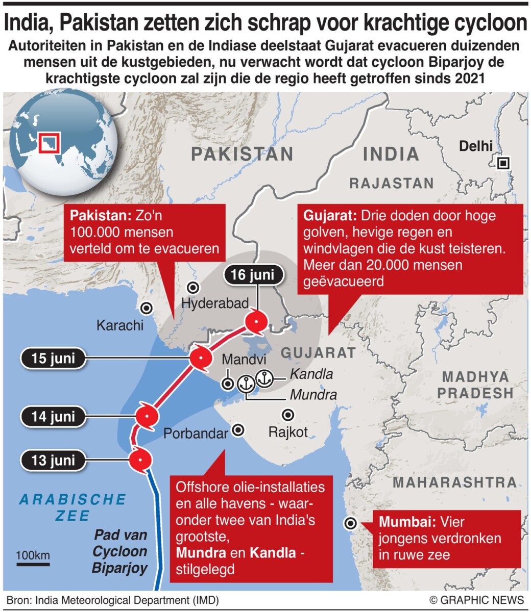 Biparjoy, geclassificeerd als een zeer zware cycloonstorm, zal naar verwachting rond donderdagavond landen tussen Mandvi in de Indiase provincie Gujarat en Karachi in het zuiden van Pakistan.