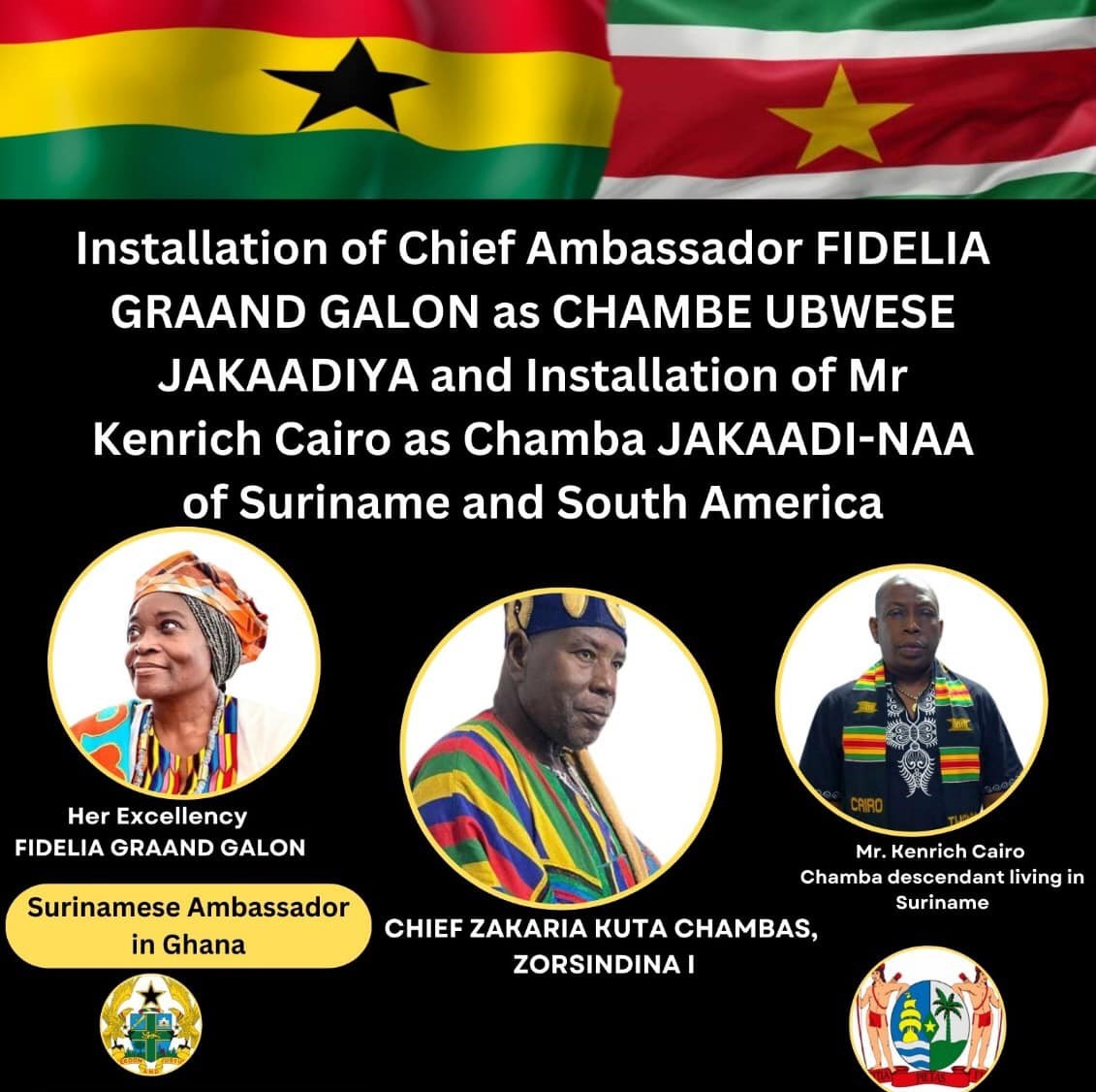Surinamers Fidelia Graand Galon, buitengewoon en gevolmachtigd ambassadrice van Suriname in Ghana, en Kenrich Caïro hebben beide een traditionele erkenning ontvangen van het Chamba volk in Ghana. Tijdens de periode van de slavernij zijn Chamba volkeren naar Suriname gebracht. De twee Surinamers zijn geëerd voor de erkenning en waardering voor het verhaal van de Chamba. Zij zullen als vertegenwoordigers van het Chamba volk fungeren in Suriname. Dit is een niet-gouvernementele aangelegenheid geweest, waar de traditionele ambtsdragers de twee personen hebben ge-eerd.