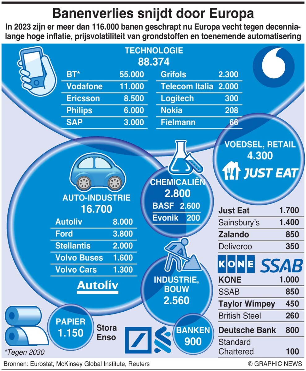 De meeste verliezen vallen binnen de Europese technologiesector. Ten minste tien bedrijven hebben dit jaar tot nu toe meer dan 88.000 banen geschrapt.