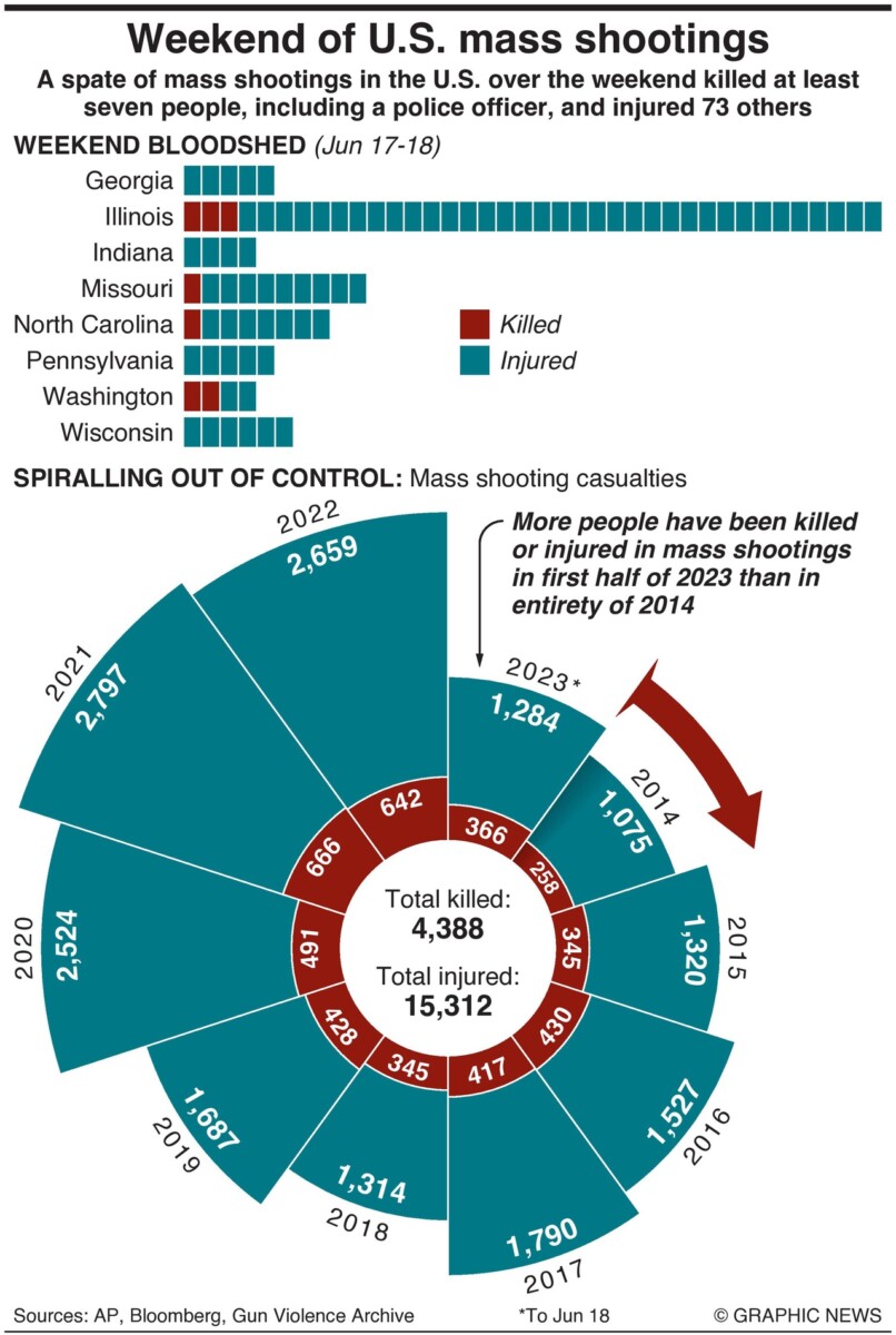 19 juni 2023 – Bij een golf van massale schietpartijen in de VS tijdens het weekend zijn ten minste zeven mensen om het leven gekomen, onder wie een politieagent, en zijn 73 anderen gewond geraakt.