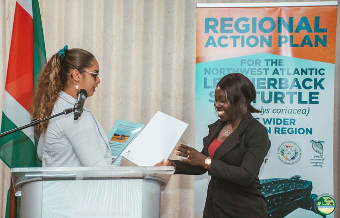 Het actieplan is tijdens deze bijeenkomst aangeboden aan Lavanda Koedemoesoe, als waarnemend Onderdirectrice Bosbeheer. Zij heeft aangegeven dat het ministerie de extreme achteruitgang van deze diersoort erkent en legt uit dat de partnerschappen die het ministerie heeft met de lokale bevolking in Galibi, WWF-Guianas, het districtscommissariaat van Commewijne en andere organisaties, nodig zijn om de handhaving- en monitoringstaken die worden uitgevoerd door het ministerie, te kunnen vervullen.
