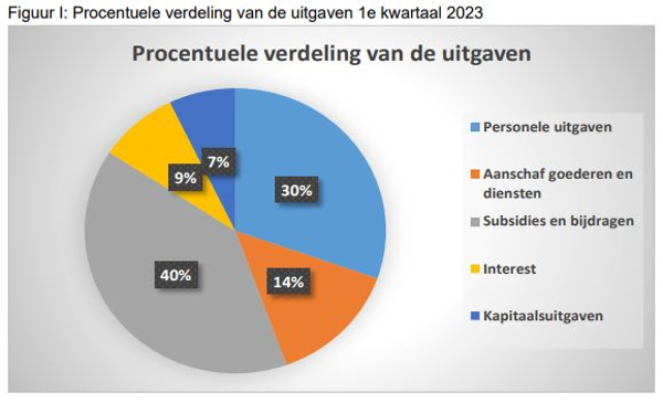 In de Nota Overheidsfinanciën over het eerste kwartaal van dit jaar valt te lezen, dat de overheidsuitgaven SRD 6.597 miljoen zijn geweest. De overheidsontvangsten lagen hoger, met name SRD 7.179 miljoen. Tot de grootste uitgaven van de overheid behoren de subsidies en bijdragen, circa 40 procent, en de personeelsuitgaven 30 procent.