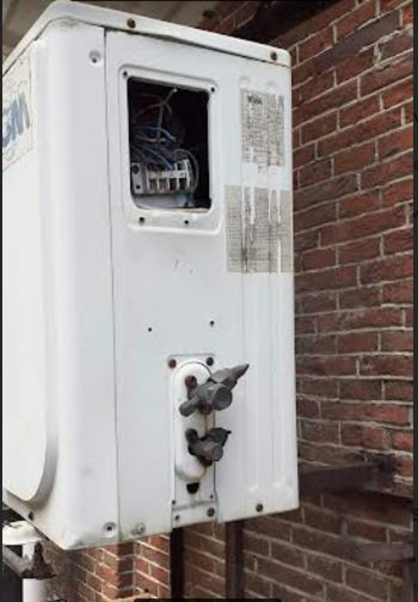(Foto: Een aircondition unit aan het Torengebouw van Financiën aan het Onafhankelijkheidsplein. Koperdieven hebben de koperenleiding losgemaakt en meegenomen.)
