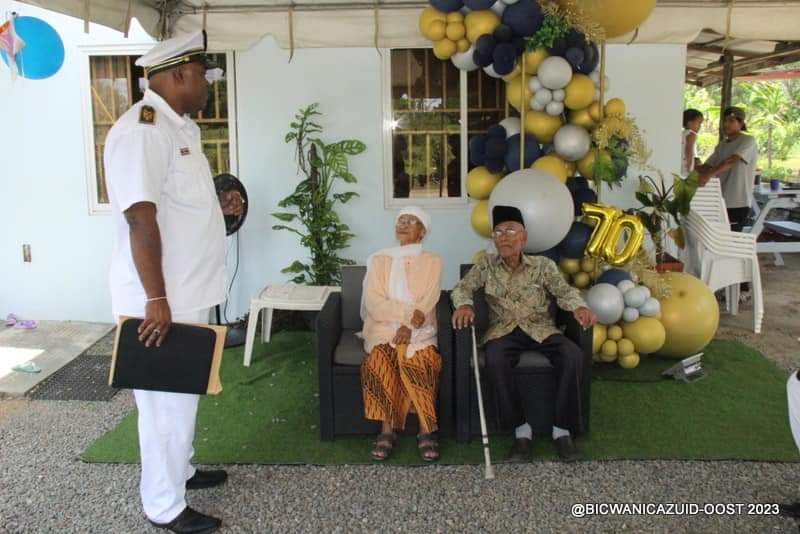 Onlangs heeft het echtpaar Sanoesi-Paiman het heugelijk feit mogen vieren dat zij 70 jaren lief en leed hebben mogen delen. Ze zijn daarom flink in de bloemen gezet door hun kinderen, kleinkinderen, families, vrienden en ook de districtscommissaris met zijn team.