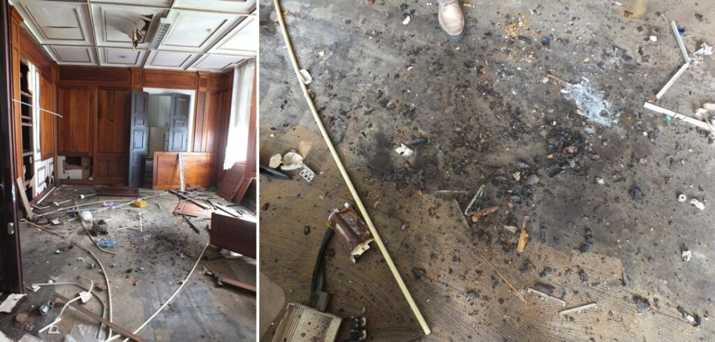 Verontrustend is, dat in de kamer van de minister sporen van vuur zijn aangetroffen. Op de begane grond werd een tissue gevonden die met een aansteker of lucifer is aangemaakt. Dit is een ernstige situatie daar het pand nog steeds niet is beveiligd, ondanks alle berichtgeving.