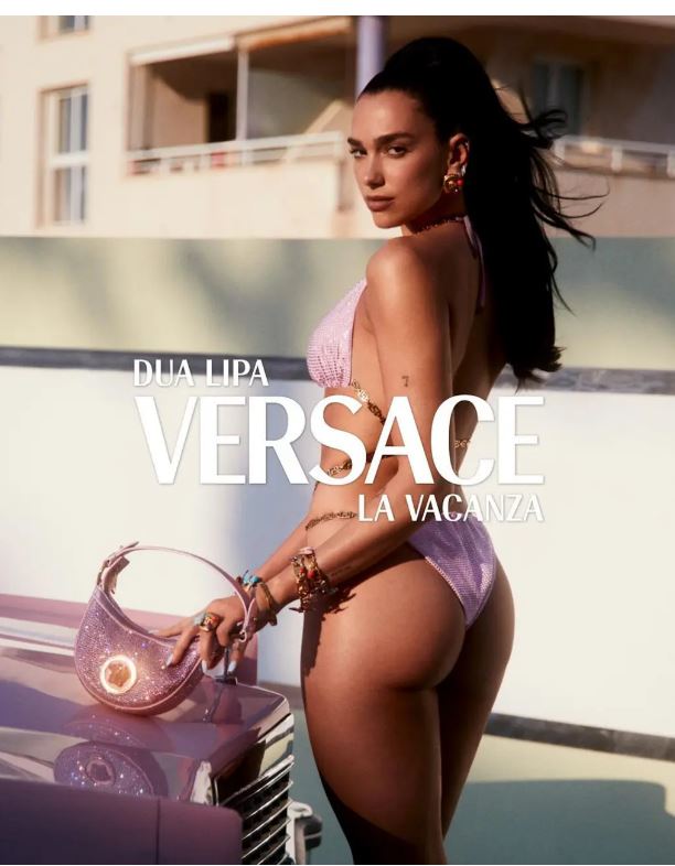 Lipa’s samenwerking met Versace debuteerde eind mei in Cannes en ze heeft eerder deze week verschillende stukken uit de collectie gemodelleerd, waaronder een met vlinders bedekte polkadotbikini.