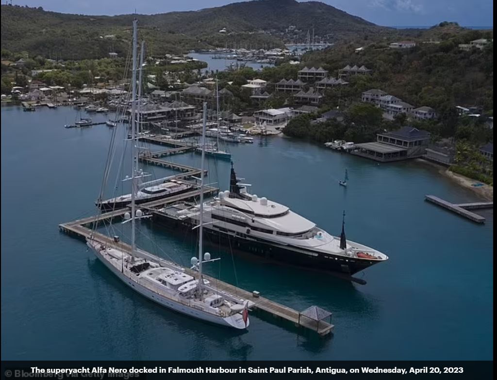 Het enorme schip, dat sinds het begin van het conflict op het Caribische eiland ligt weg te kwijnen, is een van de meest luxueuze ter wereld en beschikt over het allereerste zwembad dat in een helikopterplatform kan veranderen.
