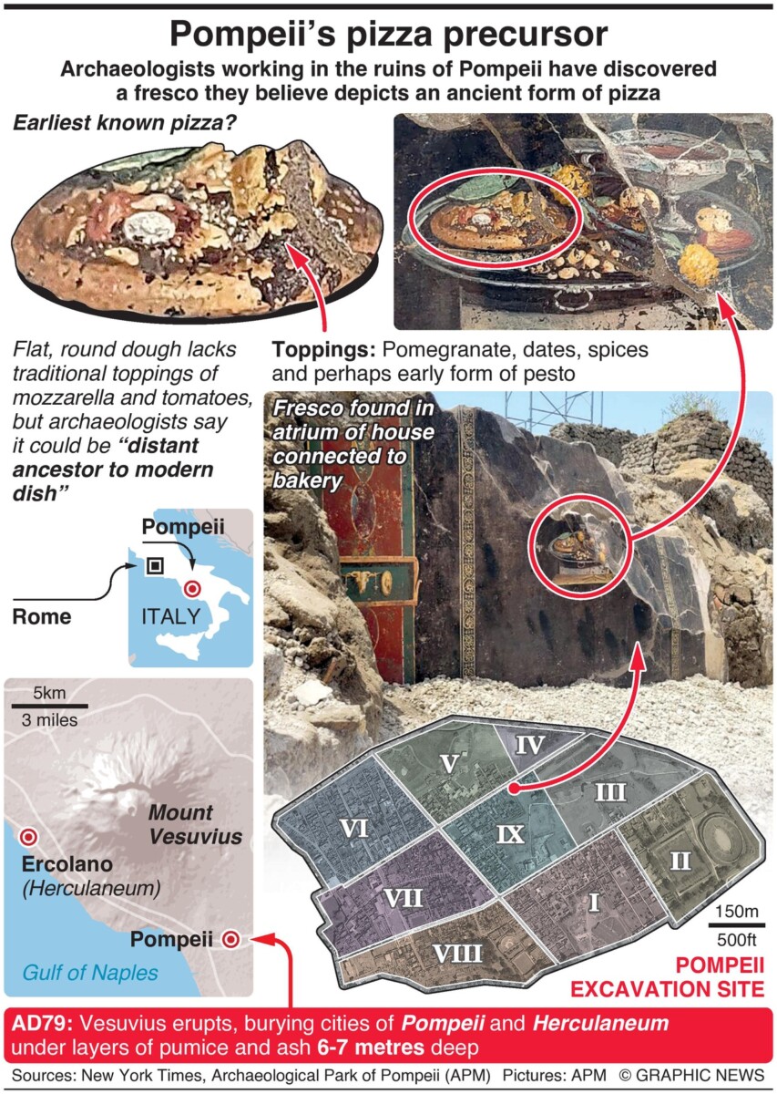 Het fresco werd ontdekt in de overblijfselen van een atrium van een huis dat verbonden was met een bakkerij. Het schilderij is een stilleven van een presenteerblaadje met wijn, fruit, noten… en de proto-pizza!
